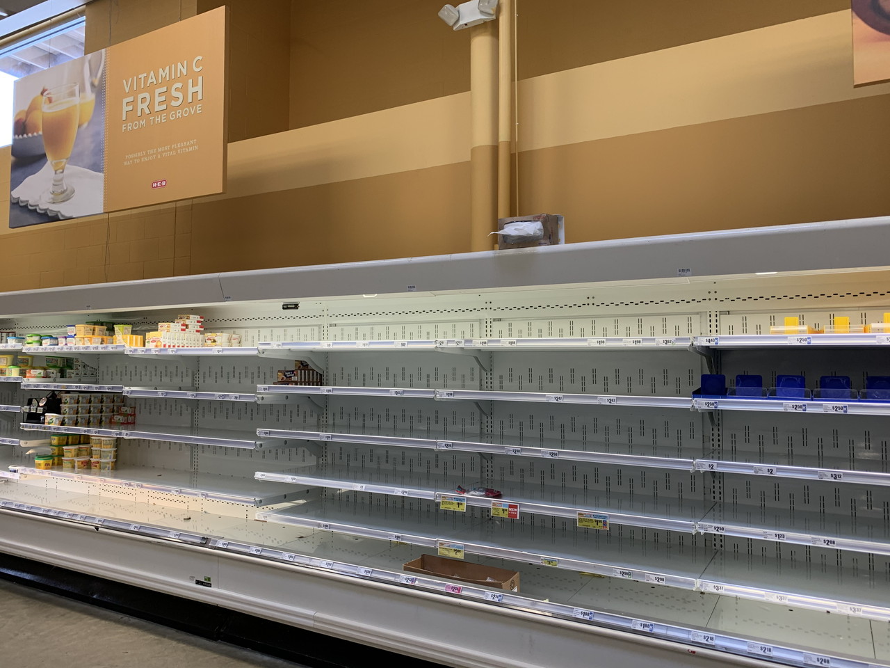 閉店時間間際のシェルフの状態。生鮮、肉類、ベーカリー、乳製品、卵などが空なのが目立っていた。
